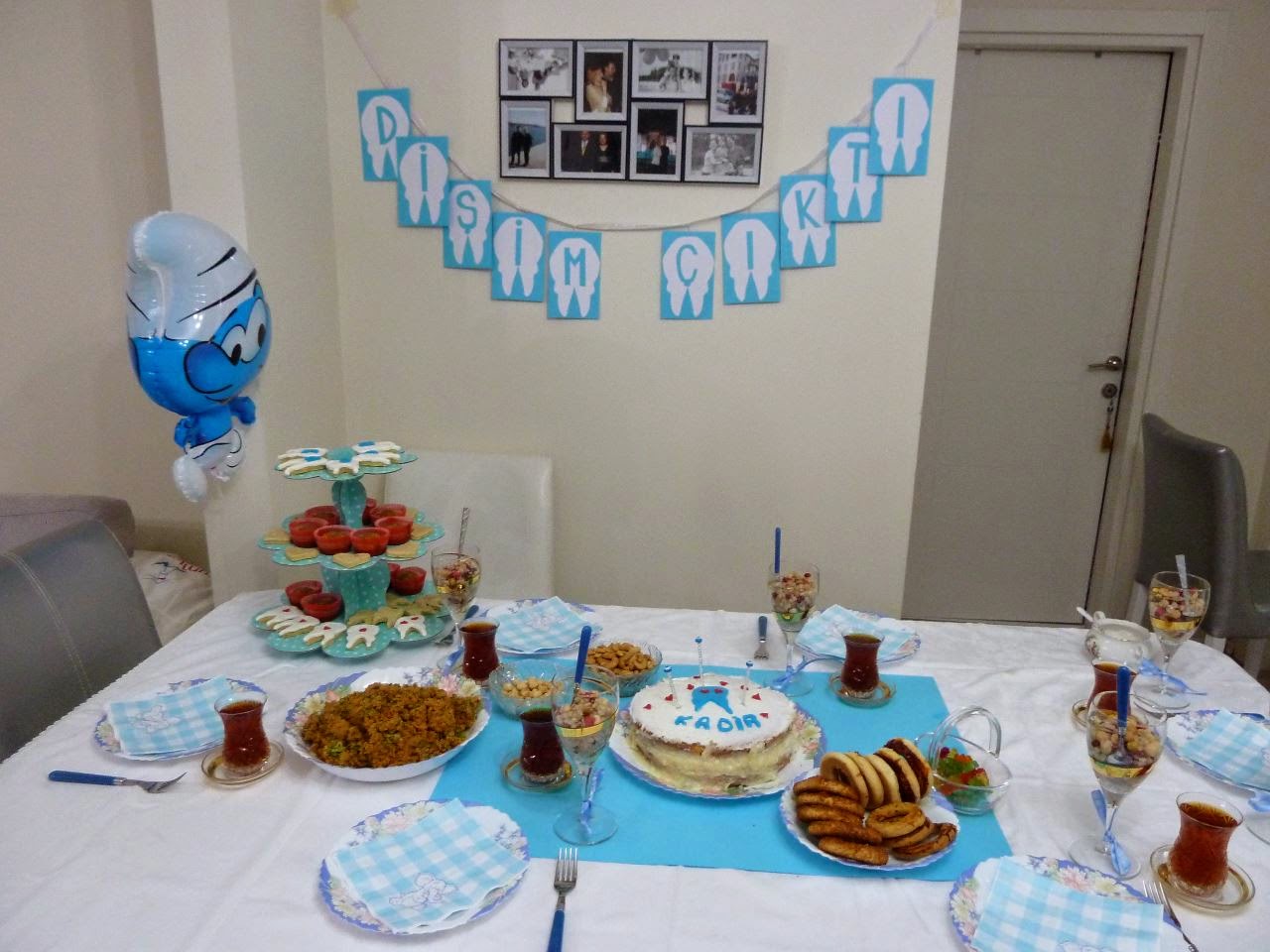 Sıra diş buğdayı kutlamasına gelmişti. İşe daha önceden aldığım diş şeklinde kurabiye kalıpları ve beyaz şeker hamuru ile diş kurabiyelerimi yapmakla başladım. Büyük bir parti yapmayı planlarken eşimin teyzesinin vefat etmesinden dolayı kendi aramızda ufak bir kutlama yapmaya karar verdim. Kimse olmayacağı için pastamızı da evde yaptık. Diş buğdayı için hazırladığım buğday, şekerli leblebi, badem, fındık, şeker, tarçın ile hazırladığım karışımı kadehlere paylaştırdım ve üzerini nar taneleri ile süsledim. Kadehlere mavi kurdelalar bağladım ve tepesinde nazar boncuğu olan cam çay kaşıklarıyla da süs yaptım. Tuzlu fincan kekler yaptım ve kartondan aldığım mavi fincan kek standına yerleştirdim. Menümü ufak tefek aparatifler ve kısırla tamamladım. Etrafı süslemek için de mavi şirin uçan balonumuz vardı. Balonu ve gece kendi ellerimle hazırladığım "dişim çıktı" duvar yazısını kullandım.